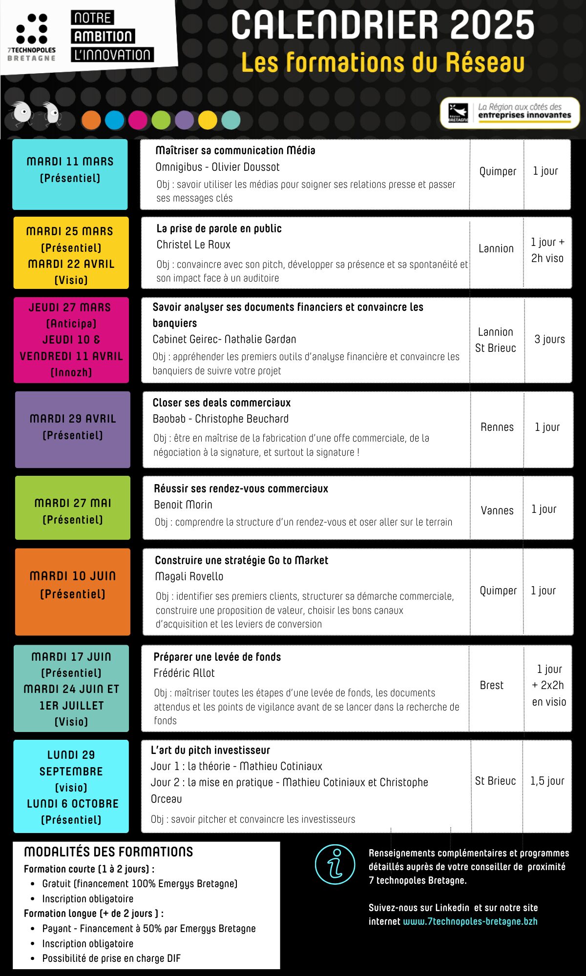 Les 7 technopoles se concertent régulièrement pour proposer un programme annuel de formations, réparti sur les 7 territoires, animés par des experts et répondant aux besoins exprimés des porteurs de projet et chefs d’entreprises sur tous les aspects inhérents à la création et au développement d’entreprise innovantes : ressources humaines, finance et gestion, juridique, communication, marketing et commercial…