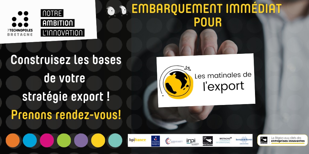 Les 7Technopoles de Bretagne s’associent à BpiFrance, aux Douanes, aux Conseillers du Commerce Extérieur de la France, à l’INPI, la Banque de France, la Région Bretagne et Bretagne Commerce International pour proposer aux entreprises innovantes bretonnes les Matinales de l’Export.